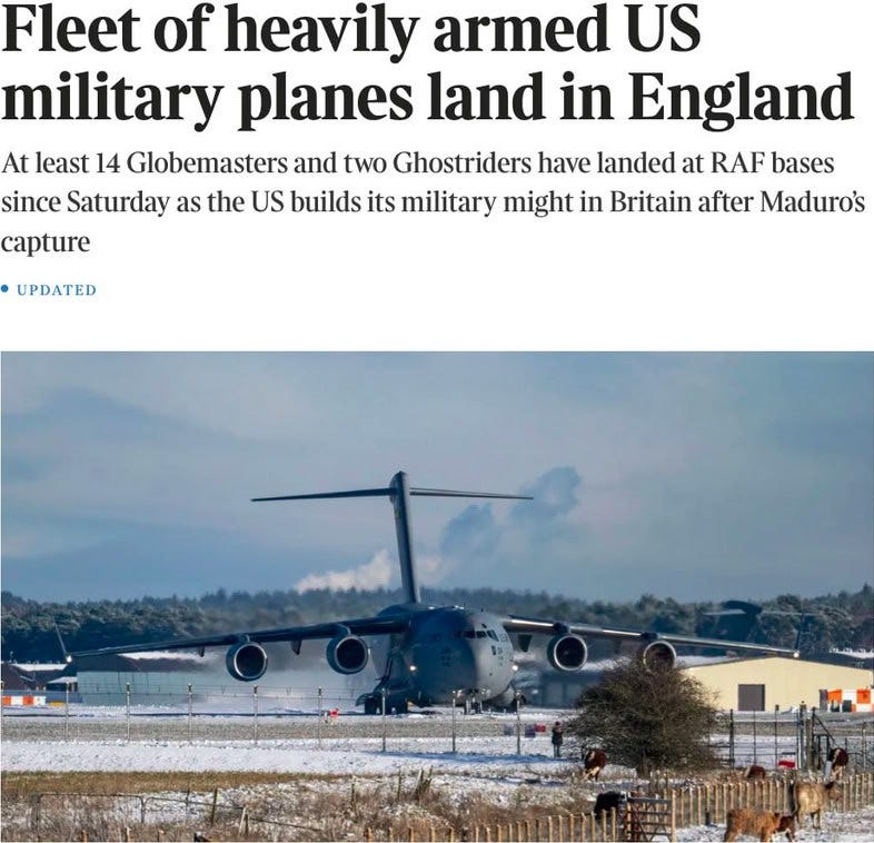 A kiadvány azt magyarázza, hogy az amerikai katonai repülőgépek „gyülekeznek” Nagy-Britanniában Trump azon fenyegetéseinek fényében, hogy támadásokat indít és annektálásokat hajt végre a világ különböző régióiban.