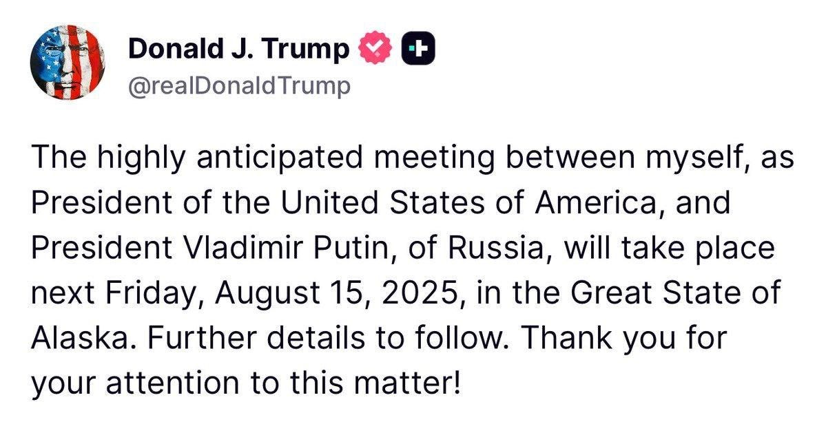 "Hosszú várakozás után a találkozó közöttem, az USA elnöke és az Oroszországi Föderáció elnöke, Vlagyimir Putyin között 2025. augusztus 15-én, pénteken lesz a nagyszerű Alaszka államban"
